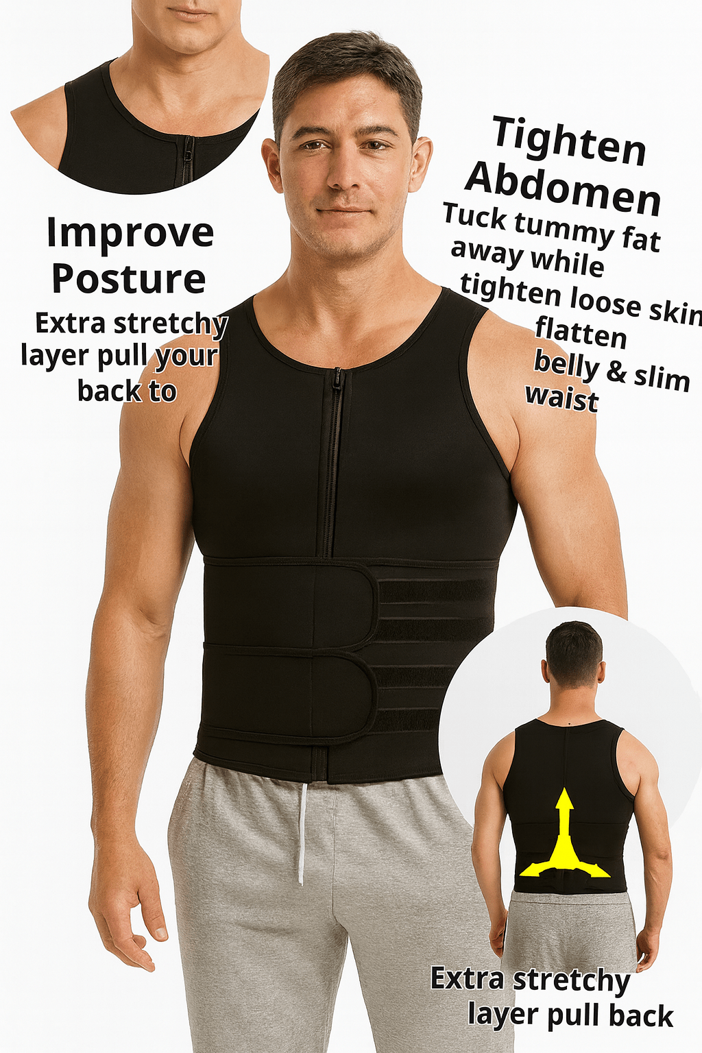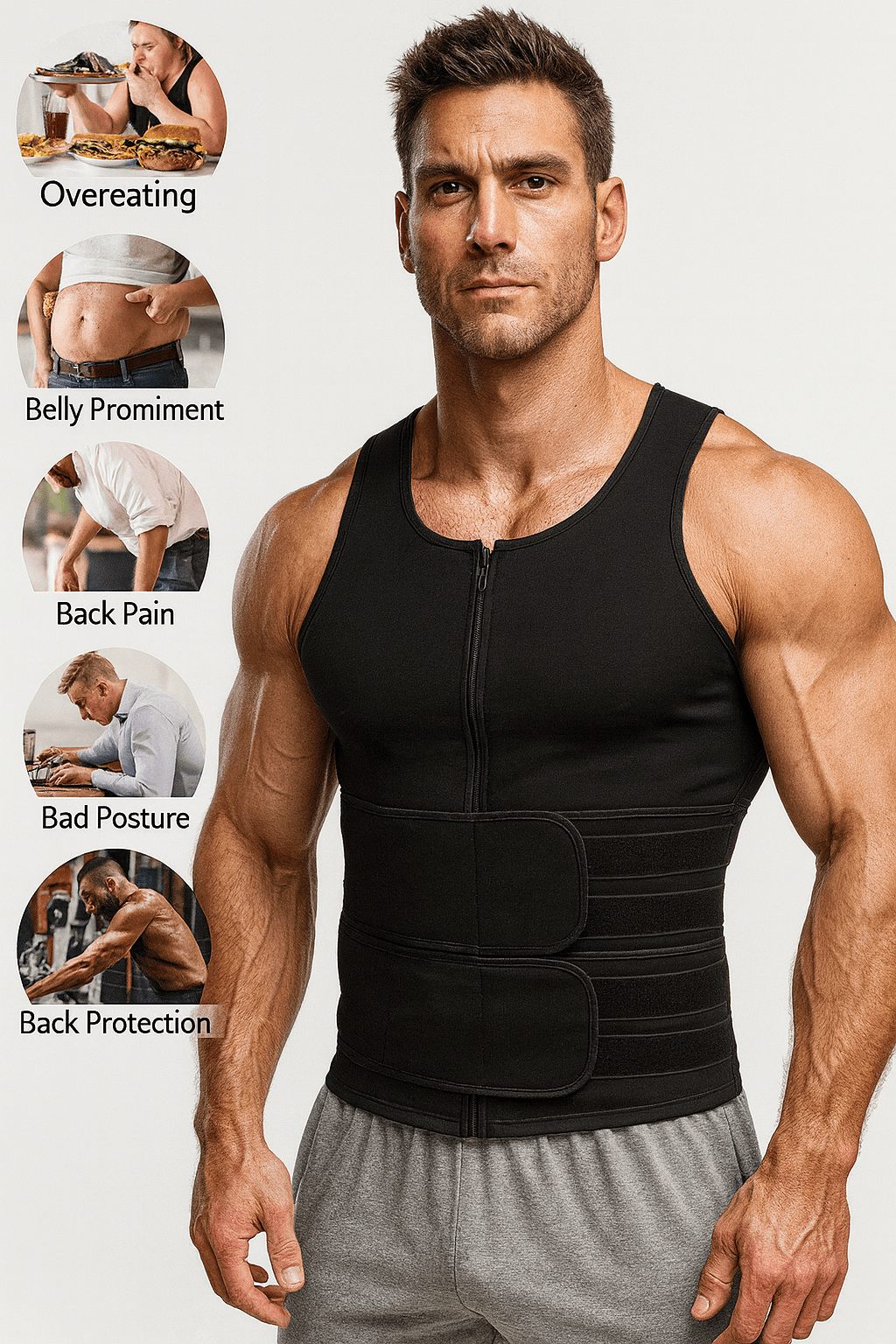 The Shredder Body slimming vest provides compression to slim the waist, a sauna effect to increase sweating and burn fat, and support to improve posture.